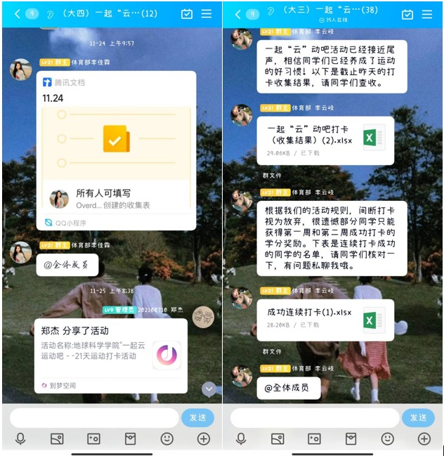 为扩大活动效果,展示同学们的运动风采,公司每三天在官Q空间发布活动进度,展示大家精彩运动瞬间和运动成果,并邀请了公司运动达人资工(卓越)21901班陈星兆和地质(工程)22001班张睿两位同学,分享自己的运动计划和感悟,引导大家科学运动,坚持锻炼。