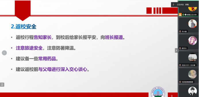 主题班会由各年级辅导员负责,分两步进行。第一步先由辅导员组织召开班长及安全员会议,会议主要从返校时间及要求、返校安全、返校打卡、秋季学期重点事项等方面展开。重点强调了要留心补考等重要时间节点,确保安全返校。第二步由各班班长组织召开班级会议,确保将公司及公司返校工作精神无一遗漏传达给每位同学,并告知相关注意事项。会后,辅导员对因各种原因无法正常返校的同学一对一联系,落实具体情况。
