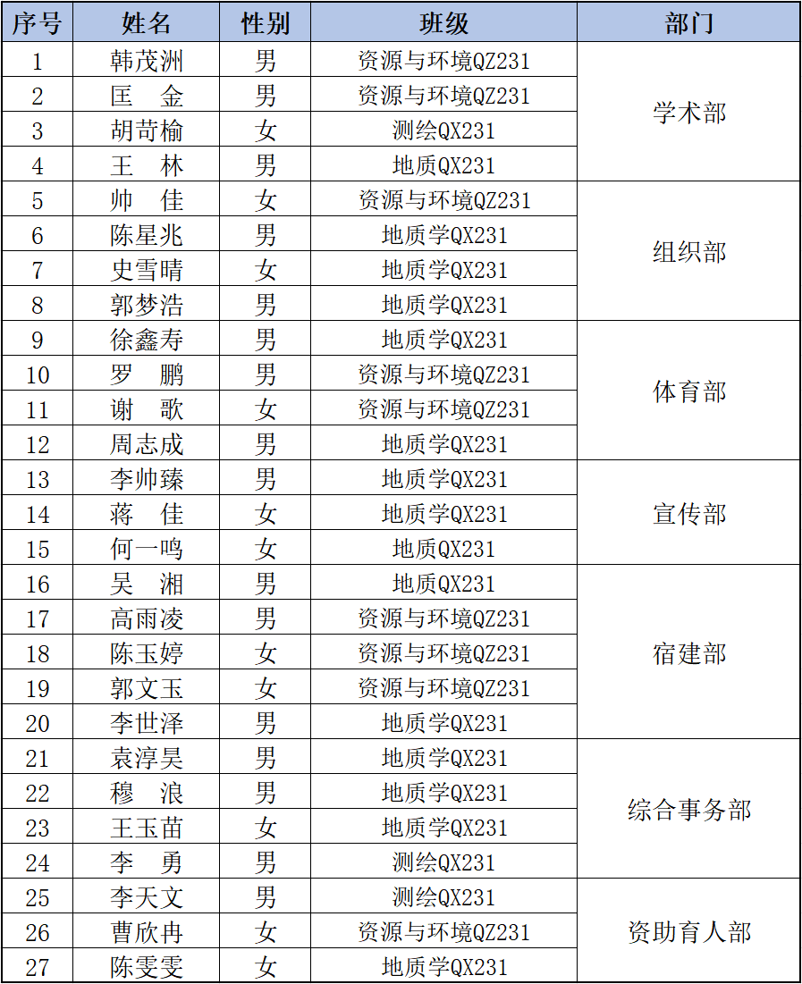 第九届研究生会拟录用名单如下: