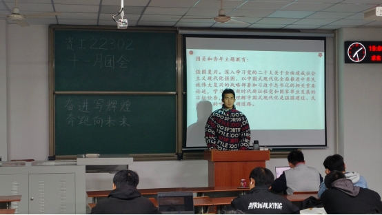 首先,肖昆明向大家介绍了本次团会的流程,明确了本次团会的开展目的与意义。接着,肖昆明通过播放“强国复兴”主题相关视频带领同学们一起学习。大家了解到在新时代、新征程,党和国家事业发展的目标和任务,深刻理解中国式现代化是强国建设、民族复兴的正确道路。随后,同学们集体进行了“青年大学习”网上主题团课的学习,明白了强国复兴的号角已经吹响,作为新时代的我们不能只是观望,更需要主动投身到国家的建设中去。我们应该怀揣对祖国的热爱,发挥自己的才能和智慧,为祖国的发展贡献力量。最后,全班同学进行了“节能环保,绿色共享”主题实践活动,同学们纷纷表示自己愿成为环境保护的宣传者和实践者。