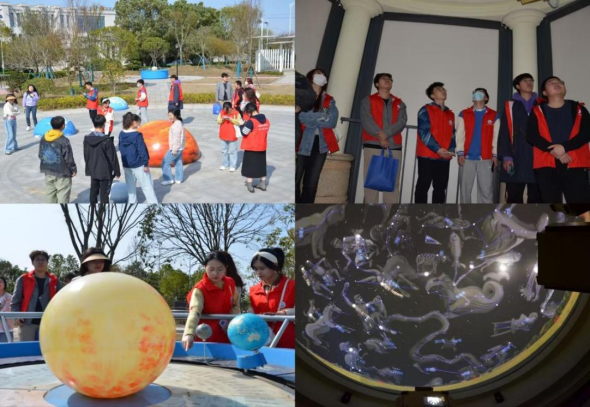 首先参观的是天体模型、星座分布等展览,在讲解员的讲解下,同学们和社区居民们了解了“天干地支”计时法的由来,以及二十四节气的划分依据。来到中央的广场,一个个巨大星球模型矗立于眼前,令人真切地感受到宇宙的广袤与深邃。随后,在圆顶投影室中,沉浸于璀璨星空之下,仿佛置身于银河之中,大家无不为自然界的神奇与美丽所折服。