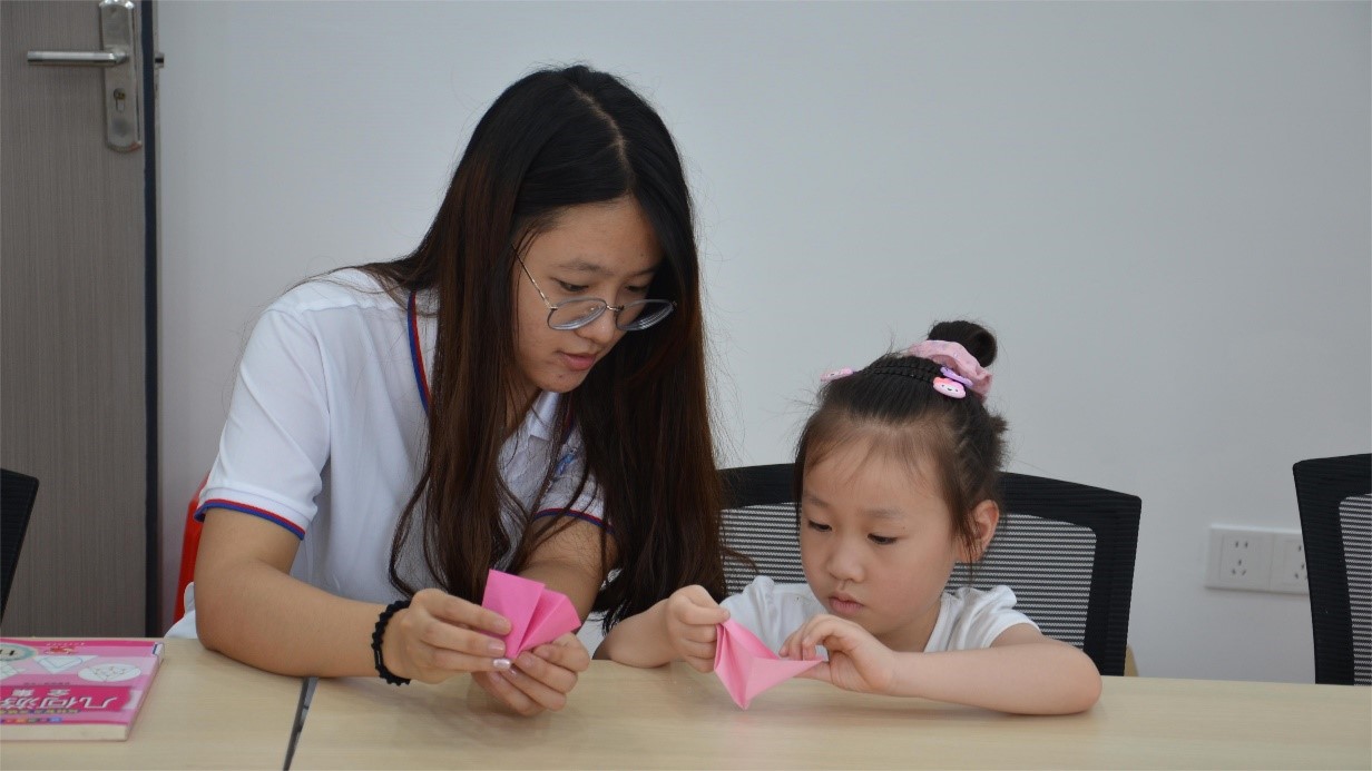 图4志愿者教孩子们折纸