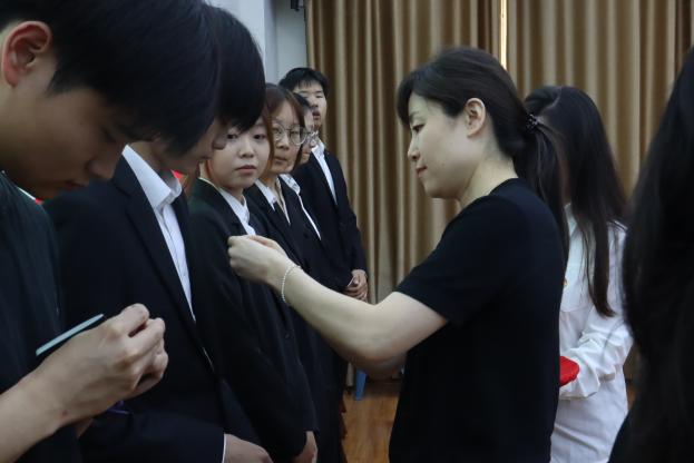 活动第二阶段举行入团仪式。在团旗见证下,8名新团员庄严宣誓。随后,新团员代表王雨鑫作表态发言:“我们将牢记习近平总书记的嘱托,以戍边志愿者为榜样,刻苦学习专业知识,积极参与志愿服务,把青春汗水挥洒在祖国边疆建设事业中!“ 最后,全体成员齐唱《光荣啊,中国共青团》,铿锵誓言与激昂歌声交织,彰显青年坚定信念。