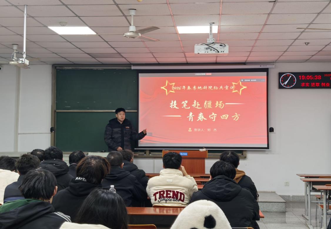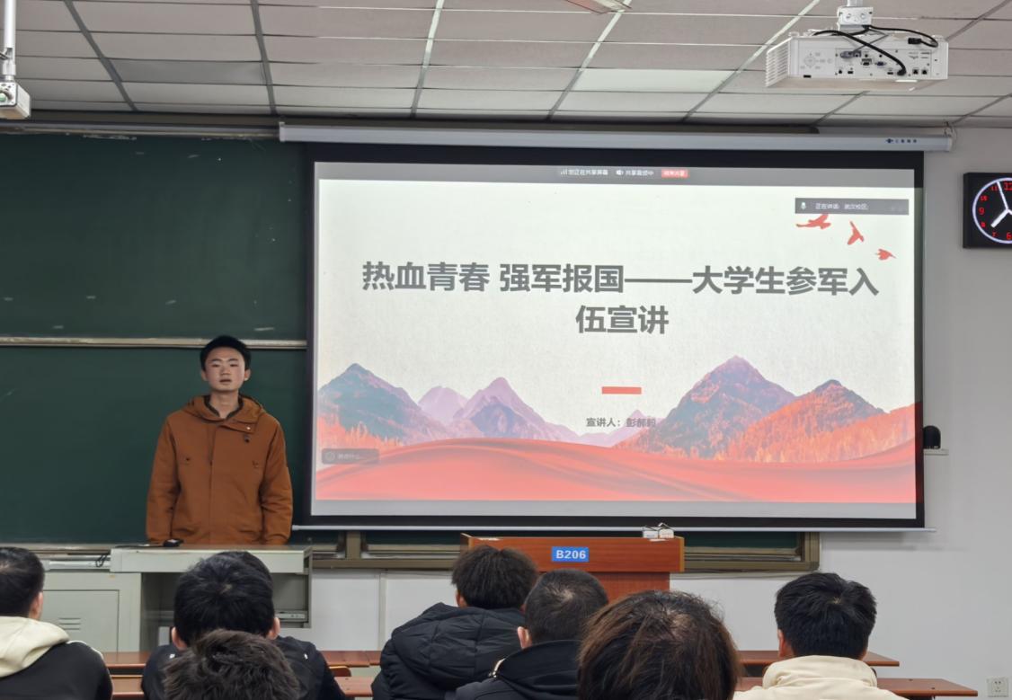 (通讯员 黄瑱 邢佰诗 李雨泽/摄)为深入贯彻落实国家征兵政策,激发在校老员工携笔从戎、报效祖国的热情。12月30日晚19:00,太阳成集团122ccvip2026年春季征兵宣讲会在武教B206以线上线下融合方式举行。会议由退伍士兵地信22401班彭郝毅、资工22304班郑杰担任主讲,辅导员乔宇、黄瑱于武汉和荆州校区同步主持,400余名员工参与活动。