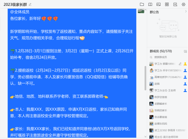 辅导员及班主任通过线上班会、QQ群、短信提醒等多种方式,全覆盖开展返校安全教育,重点强调交通安全、天气变化应对、途中防护等内容,帮助员工增强安全意识,合理安排行程。同时,组织开展考风考纪教育,提醒补考员工认真备考、诚信应考。